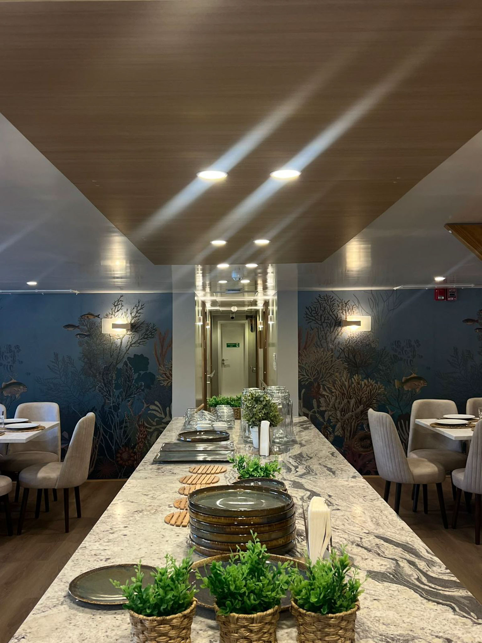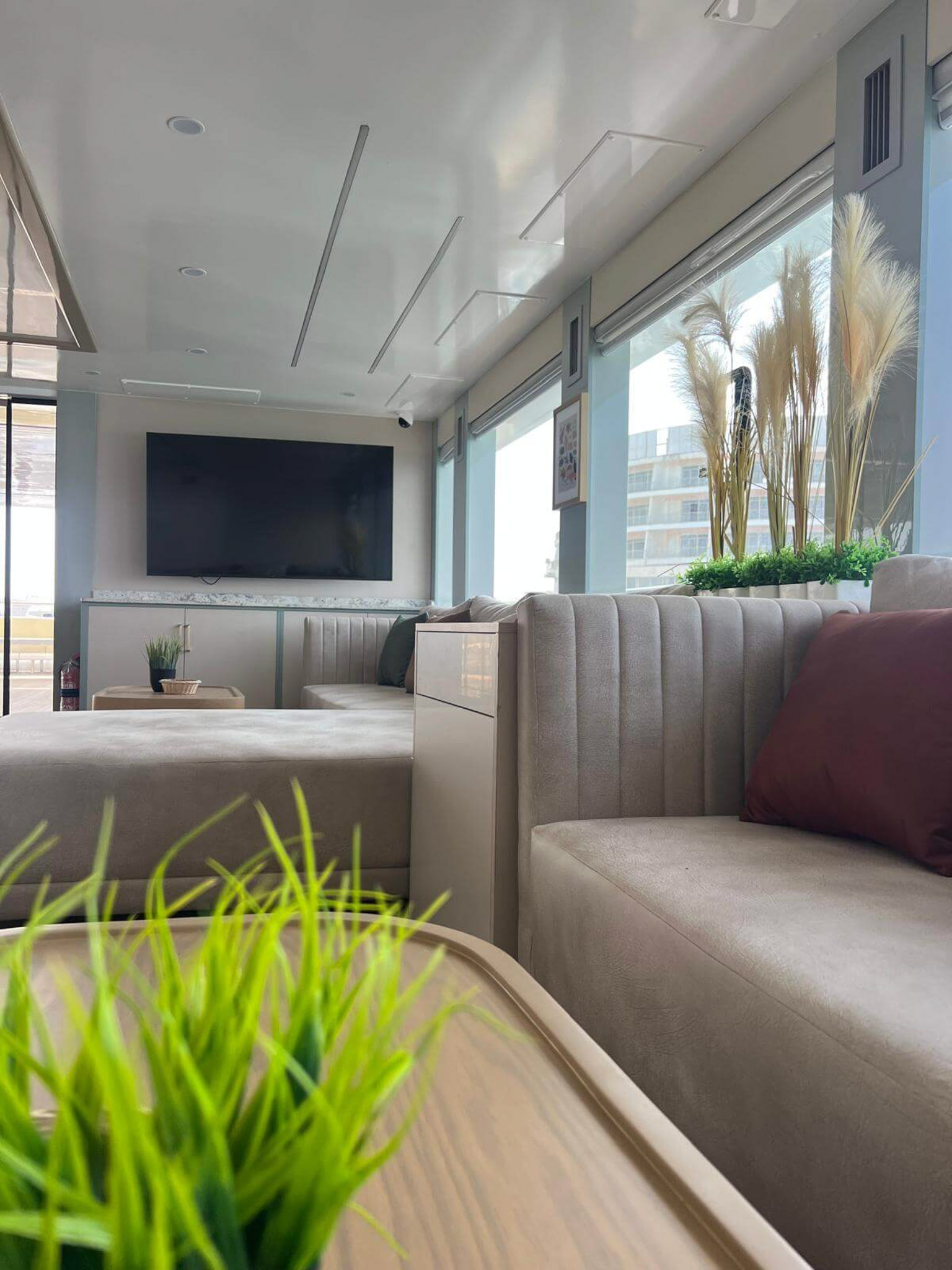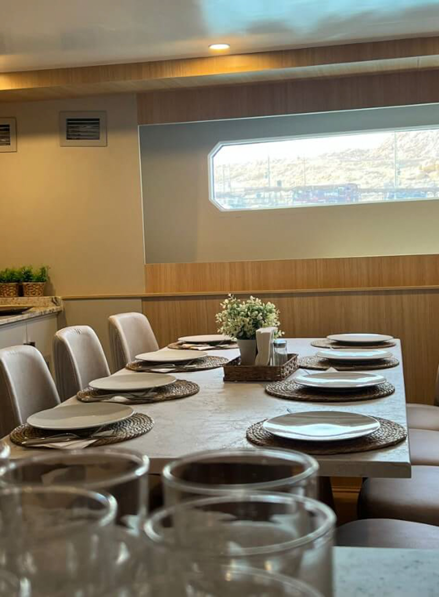 Safy Mar oferuje wiele miejsc do odpoczynku i integracji. Dwa salony z wygodnymi kanapami, systemem audio i przestrzenią do oglądania zdjęć z nurkowań sprzyjają wspólnym wieczorom. Na pokładzie znajduje się również salon masażu oraz przestronna restauracja serwująca smaczną kuchnię. Sundeck z leżakami, pufami i barem to serce łodzi – idealne miejsce na relaks po zejściu z wody.